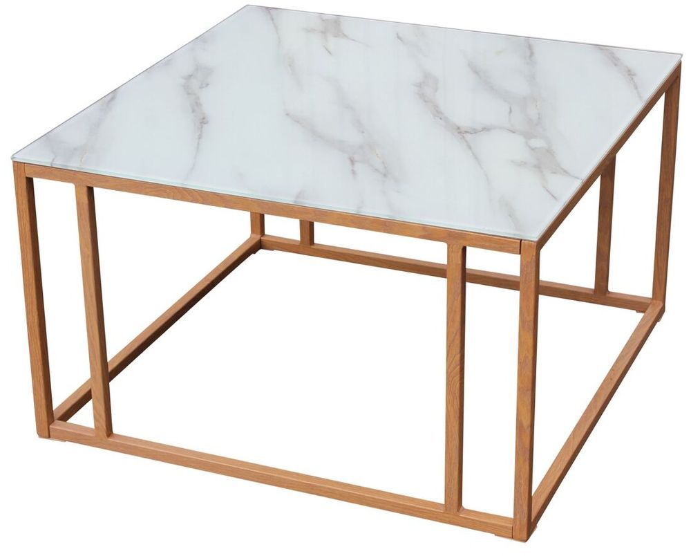 Link är en serie soffbord i varierad färg och form. Detta bord har ett underrede av metall i ekimitation och bordsskiva av vitmönstrat glas.