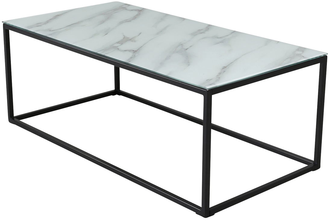 Link rektangulärt soffbord med en marmorerad glasskiva och benställning i svartlackad metall.