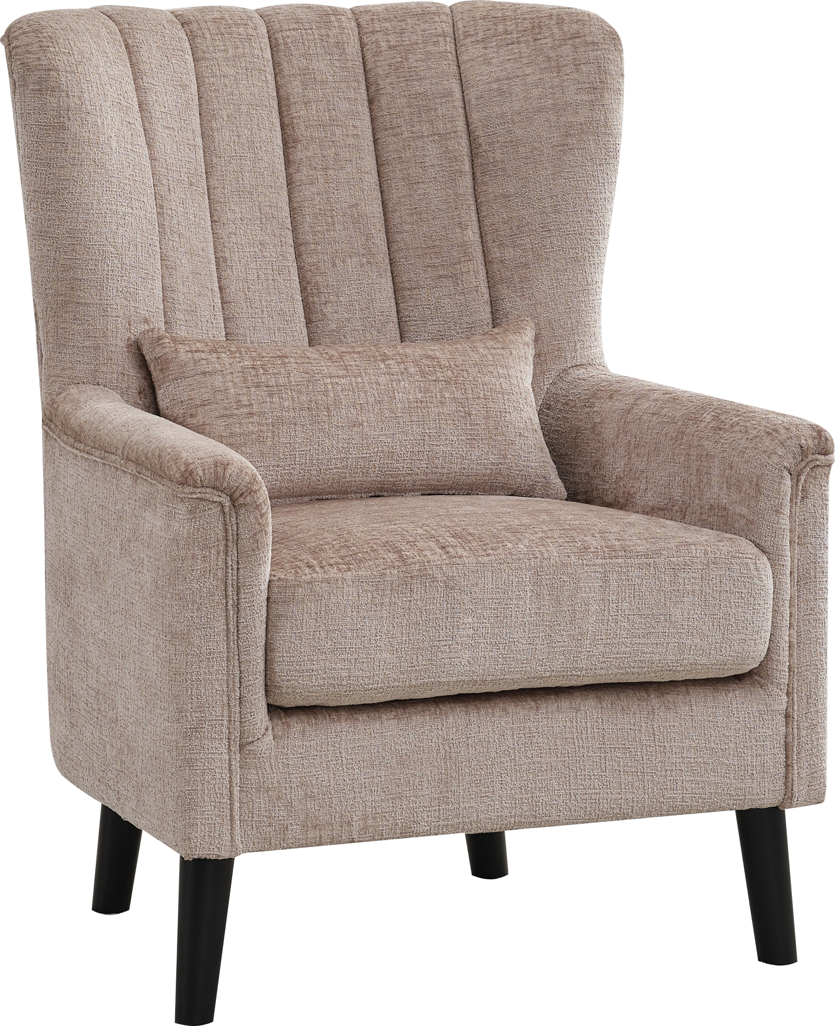 Fåtölj i beige bouclétyg med träben och 1 kudde. Levereras omonterad.