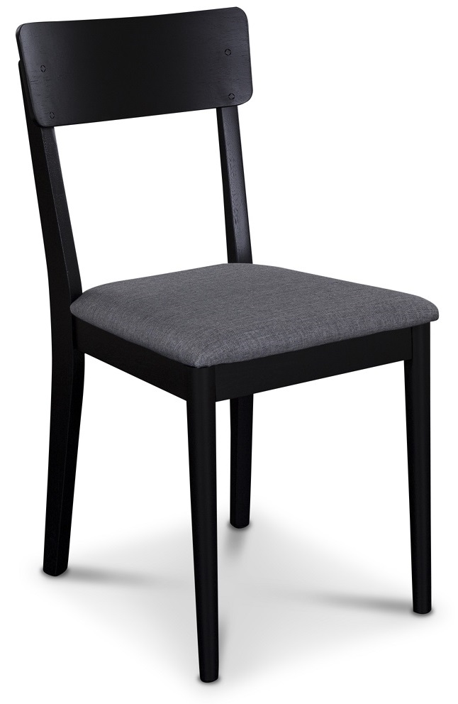 Linnea matstol är en elegant stol i massiv svartbetsad ek med bekvämt böjd ryggplatta. En stoppad sits med klädsel i grått tyg ger en behaglig sittupplevelse.