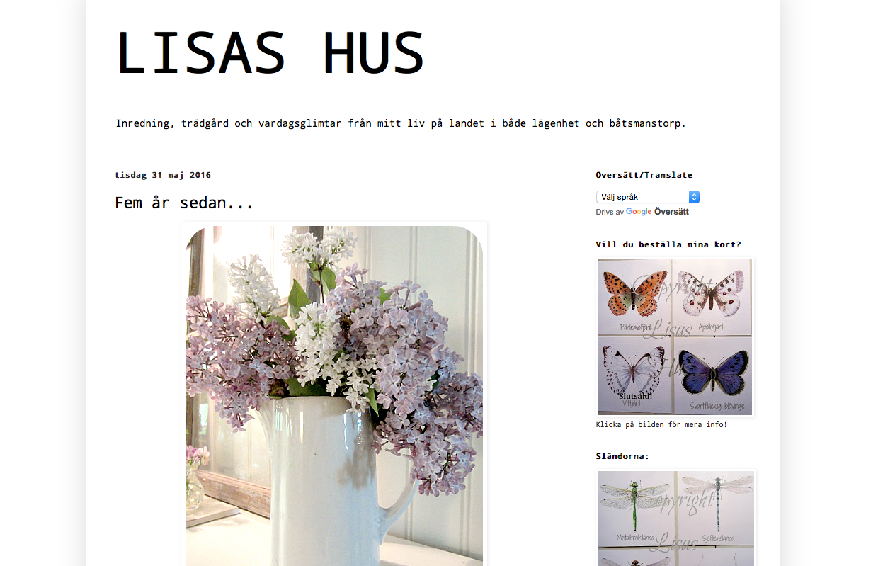 Lisas torp en blogg om ett andningshål, ett torp på landet som istället blev bloggen LISAS HUS i samband med en flytt till trakterna av torpet. Nu bor Lisa i en lägenhet men i samma trakt. Drömmen om det lilla livet blev på så sätt förverkligat efter att ha lämnat Stockholms innerstad. Båtsmanstorpet finns förstås kvar med sin charmiga trädgård. Speciellt i dessa tider går det inte att undgå att just trädgård är ett stort intresse vid sidan om inredning då vi kan se härlig bilder på försommarblommor, som liljekonvalj, syren, kaprifol och grannens trädgårdskaprifol. Buketter av alla sorter hittar sin väg in både torp och lägenhet. Bloggen följer på så sätt årstiderna. Vi får följa vardagsliv och lite fest. Lisas proffesion som bildkonstnär vävs in i hennes inredningar som är charmiga och mera växer fram än tänks ut och följer en plan.