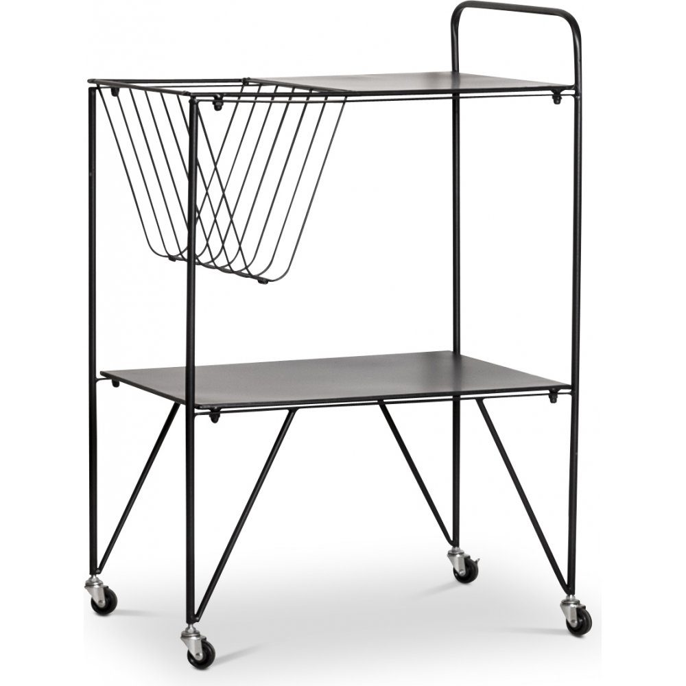 En klassisk serveringsvagn i stilren design i svartlackat stål med tidningsställ.