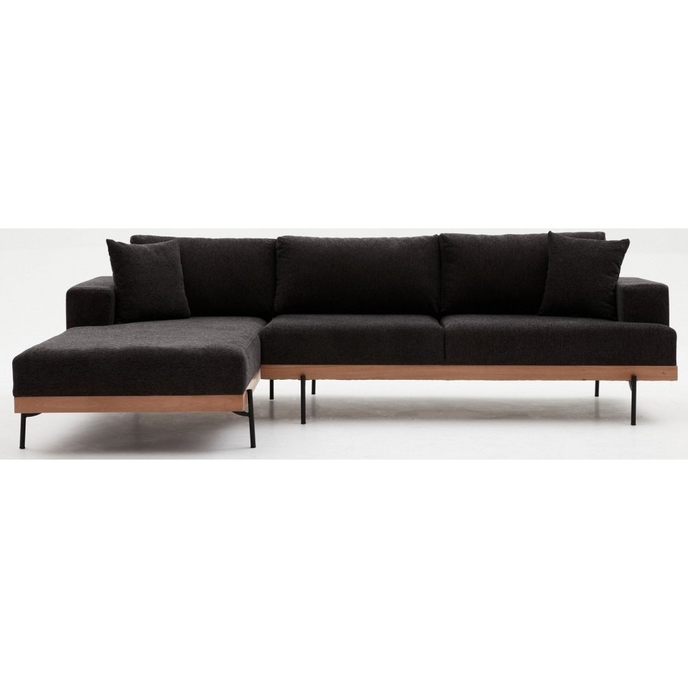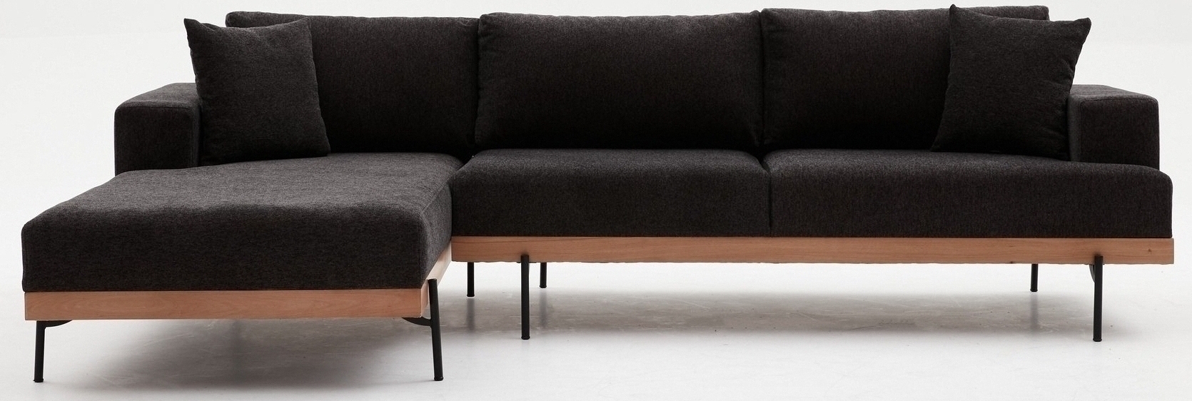 Soffa av bokträ med ben av metall och klädsel av polyester.
