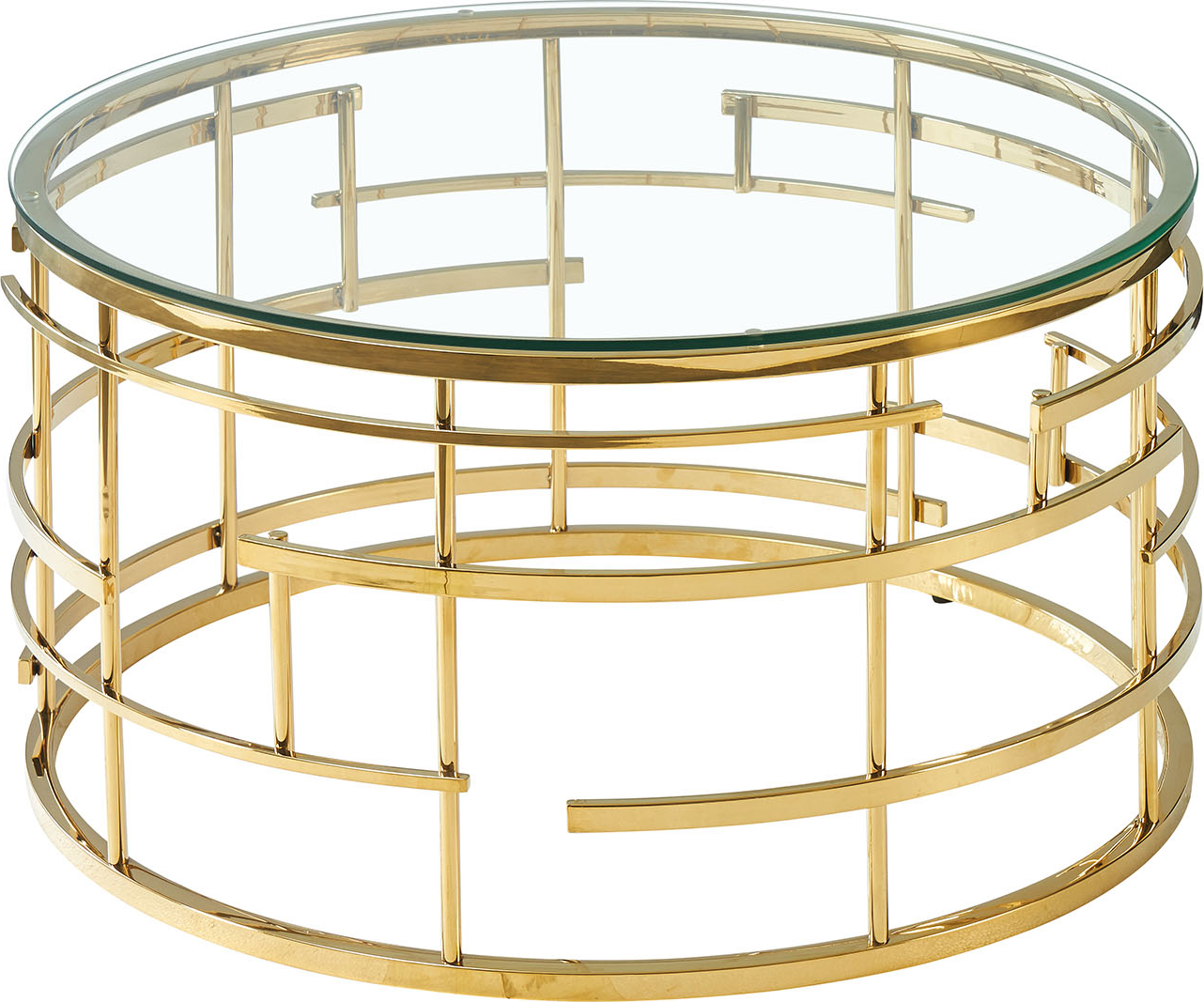 Soffbord av rostfritt stål. Bordsskiva av tempererat glas.