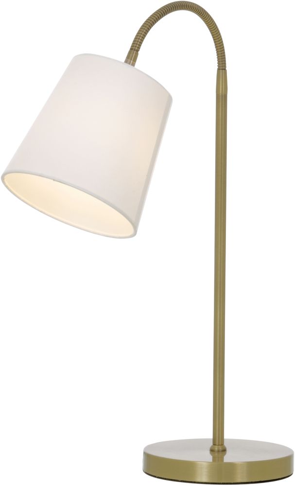 Bordslampa i metall med antik mässings utförande. Lampskärm i textil ingår.