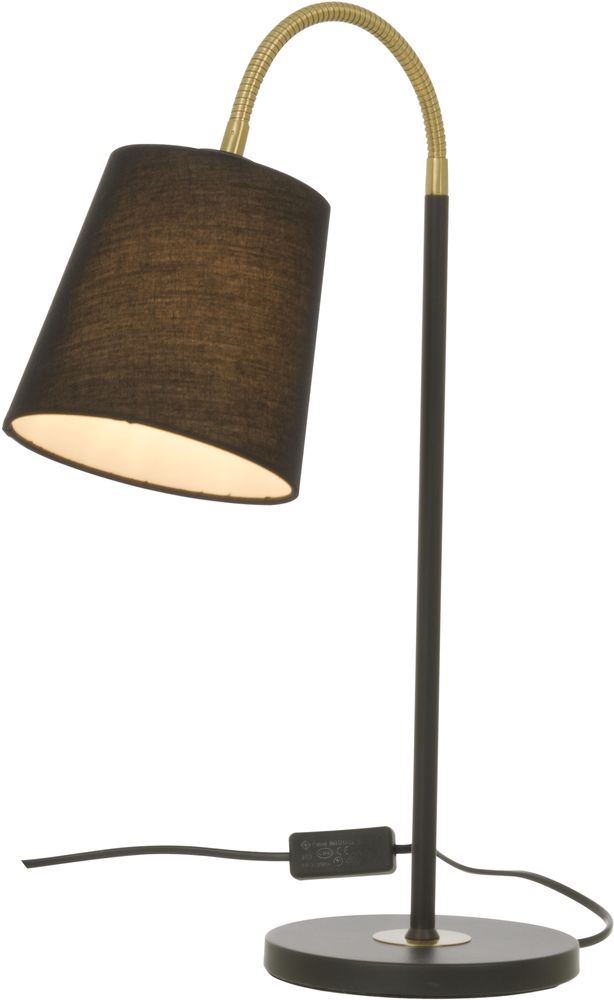 Bordslampa i metall med svart och matt mässings utförande. Lampskärm i textil ingår.