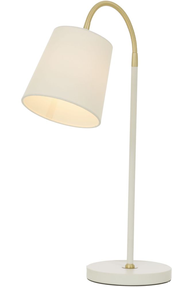 Bordslampa i metall med vitt och matt mässings utförande. Lampskärm i textil ingår.