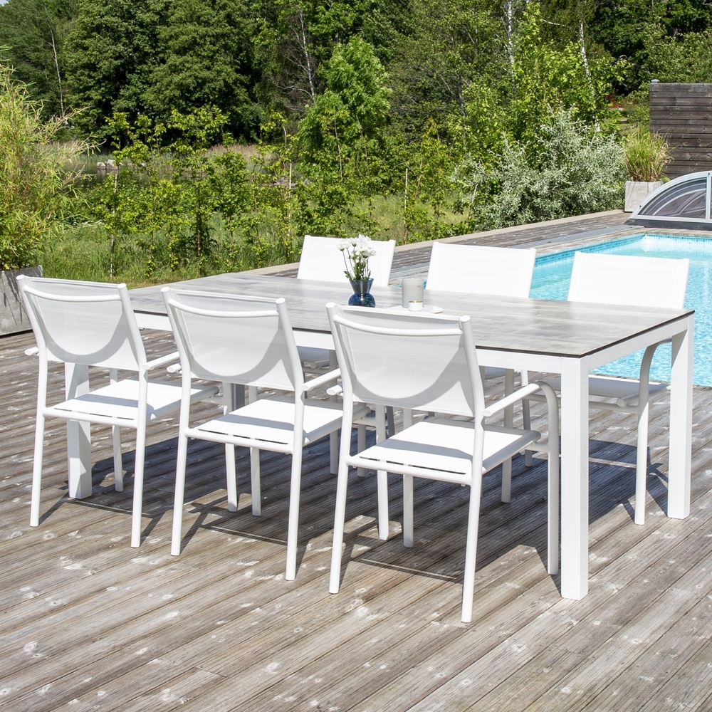 Möblera uteplatsen i en stilren look med matbord Llama! Bordsskivan är i lätt gråmönstad HPL och underredet i vit aluminium. De raka nordiska formerna och tidlösa kulörer ger dig ett matbord som står sig över tid. Bordet lämpar sig för utomhusbruk och passar därför utmärkt både i trädgården och i uterummet! Matcha med ett par bekväma matstolar så får du en komplett matgrupp till sommarens måltider! Skötselråd: HPL är en förkortning av materialet högtryckslaminat. I grund och botten är HPL precis detsamma som vanlig laminat men där man istället använt sig av ett kraftpapper mellan yta och kärna. Kraftpappret gör att materialet i sin helhet blir mer tåligt när det kommer till värme och tryck.