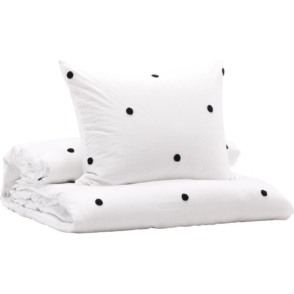 Bäddset som är lika gosigt att bädda ner sig i som det är skönt att sova på. Sängkläderna är tillverkade i det slitstarka och sköna materialet microfiber som är tvättåligt och står sig över tid. Bäddsetet är vitt med svarta tuftade prickar som skapar ett livfullt blickfång i trendiga kulörer.
