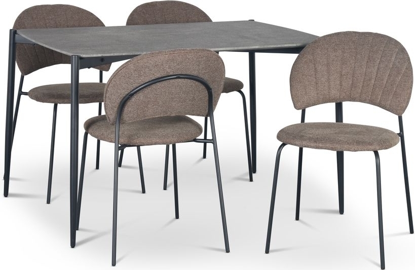 Lokrume matgrupp bestående av ett 120 cm stort bord med toppskiva av MDF i utförande betongimitation, underrede av svart pulverlackerad metall. Ingår gör också 4 st Hogrän stolar med brun klädsel och svart stomme. En matgrupp i stilren modern design. Fokus på att vara minimalistisk i sitt utförande och färgval som passar bra ihop.