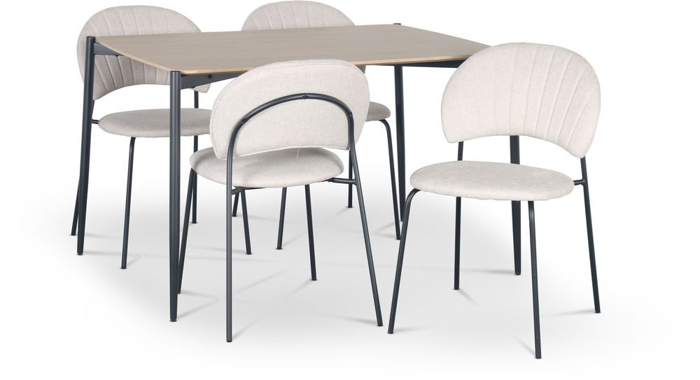 Lokrume matgrupp bestående av ett 120 cm stort bord med toppskiva av MDF i utförande ljust trä, underrede av svart pulverlackerad metall. Ingår gör också 4 st Hogrän stolar med beige klädsel och svart stomme. En matgrupp i stilren modern design. Fokus på att vara minimalistisk i sitt utförande och färgval som passar bra ihop.