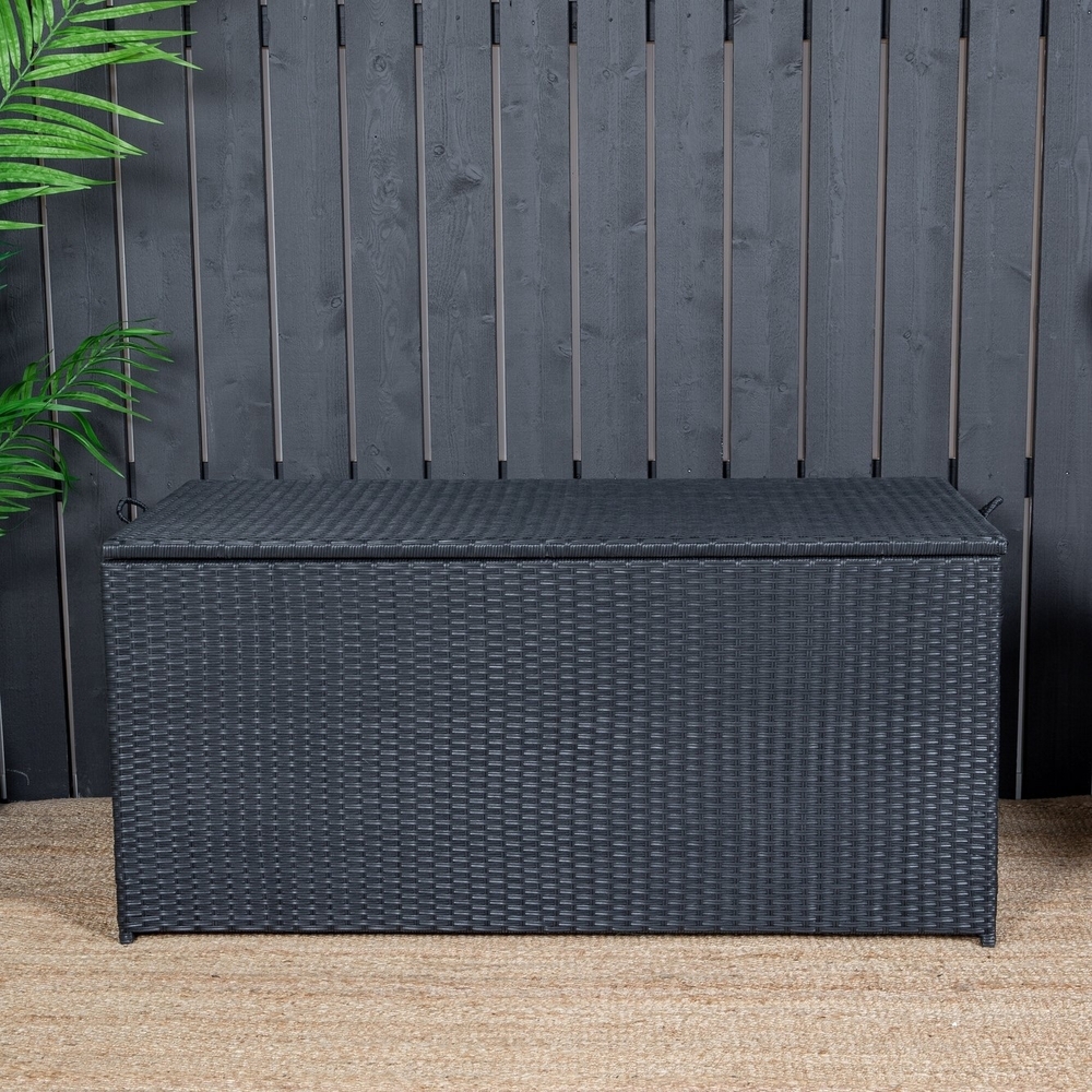 Förvara dina dynor till utemöblerna på ett snyggt och praktiskt sätt med hjälp av London dynbox i svart kulör! Med en rymlig dynbox kan du förlänga livslängden på dynorna - en smart förvaringslösning som funkar lika bra i förtältet som på altanen eller balkongen. Skötselråd: Konstrotting är ett plastmaterial som passar alldeles utmärkt för vårt skandinaviska klimat. Materialet är UV-beständigt och tåler väder och vind. Att det är UV-beständigt gör att möblerna inte bleknas, däremot rekommenderar vi alltid att förvara möblerna under ett möbelskydd eller på annat vis torrt och svalt - för att förlänga livslängden.