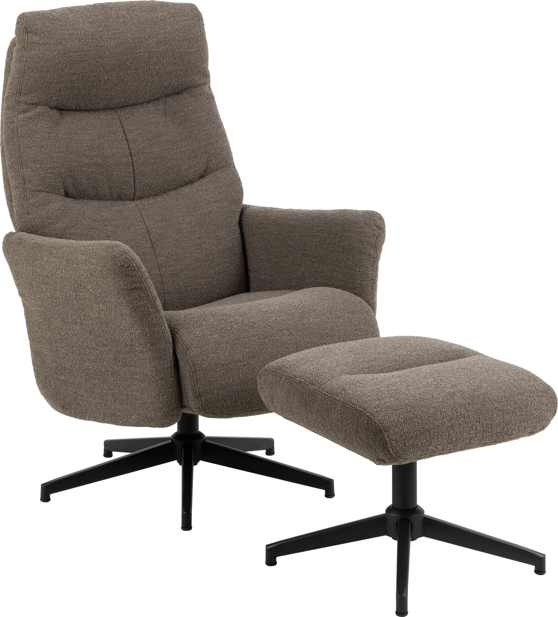Reclinerfåtölj med tillhörande fotpall. Klädsel av tyg och underrede av pulverlackerad stål. Manuell recliner-funktion.