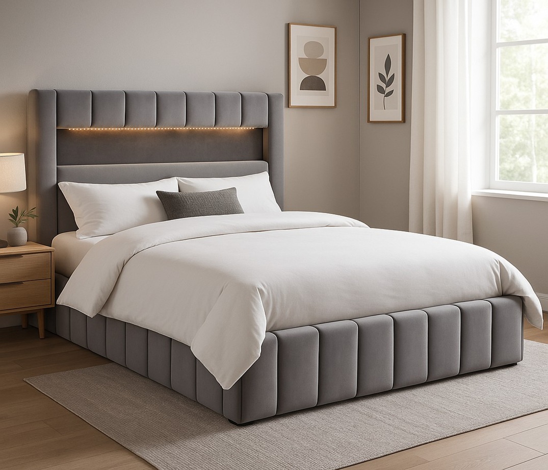 Louis säng med sängavel och inbyggd LED-belysning. Både säng och sänggavel är klädda med ett sammetstyg av polyester. Komplettera med en 180 x 200 cm:s madrass. Om man inte kan enas om vilken madrass man ska ha går det även att använda 2 st med måtten 90 x 200 cm.