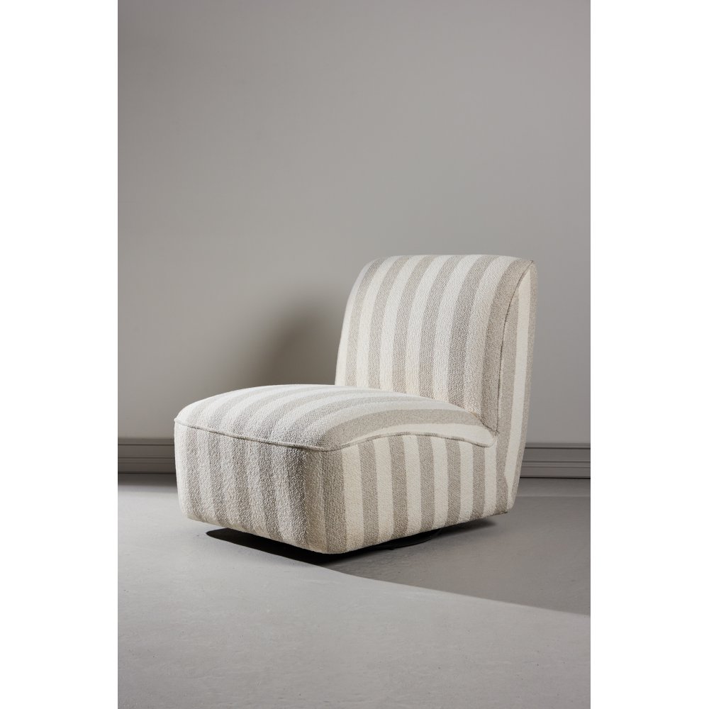 My är en inbjudande loungestol utan armstöd, designad för att erbjuda både komfort och karaktär. Den generöst vadderade sitsen och ryggen ger en behaglig sittupplevelse – perfekt för avkoppling, läsning eller långa samtal. Stolen utmärker sig med sitt textilklädda tyg i breda, vita och beiga ränder som ger ett lekfullt men samtidigt elegant uttryck. Tack vare den avskalade formen passar My lika bra i vardagsrummet som i sovrummet eller hallen – en flexibel och stilren fåtölj för det moderna hemmet.