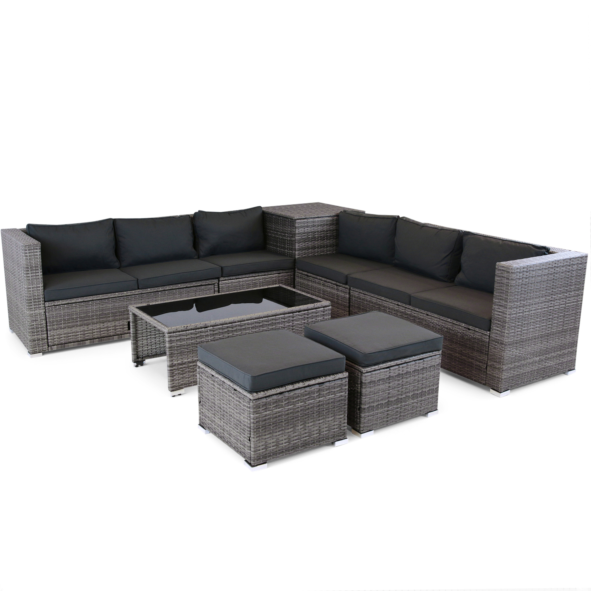 Designen är modulbaserad och kan placeras på flera sätt för att anpassas efter uteplatsens yta. Dynorna är extra tjocka och klädda i mörkgrå polyester med avtagbara överdrag för enkel tvätt. Med följer även ett regnskydd i PE-material som monteras i dynlådorna efter installation.