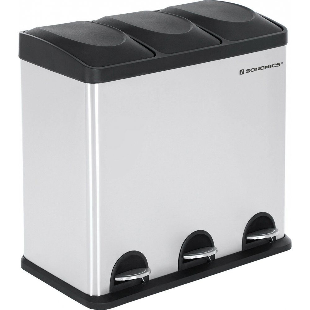 Soptunna av stål med 3 separata fack. Varje fack har en egen plastbehållare och pedal.