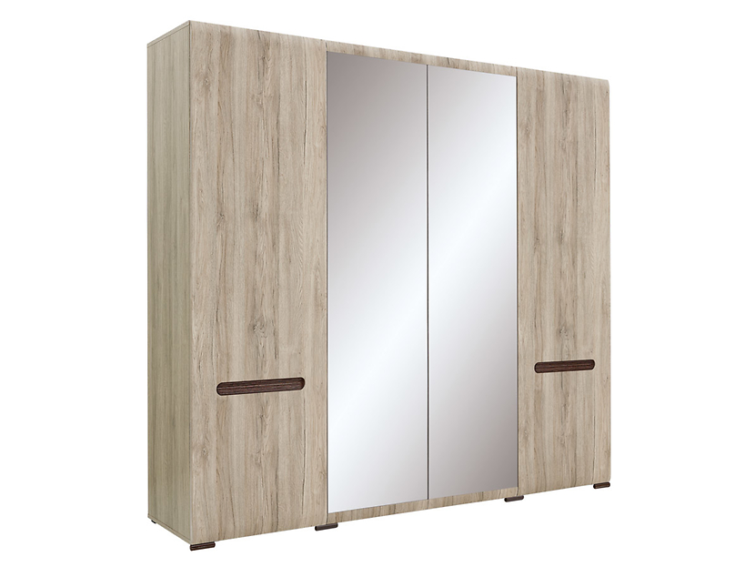 En garderob ekimitation i modern stil. En mycket rymlig garderob med fyra dörrar. Dörrarna i mittsektionen har spegelglas och inuti är garderoben smart inredd för att underlätta att hålla ordning på kläderna.Handtagen är integrerade med en wengefärgad räfflad baksida som en snygg detalj.