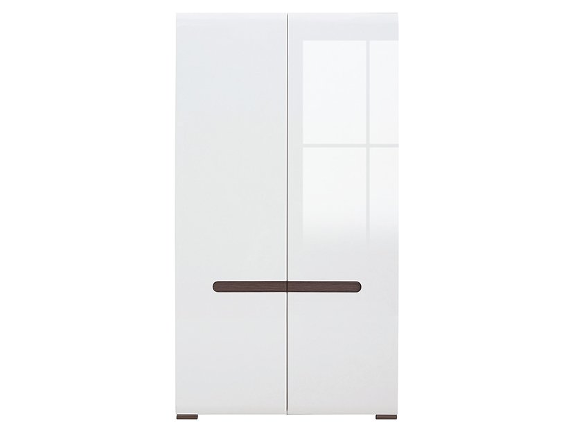 En vit högblank garderob i modern stil. Garderoben har 2 dörrar med integrerade handtag, bakom handtagen finns en wengefärgad remsa som en liten extra detalj. Inuti garderoben finns en klädstång med en hylla ovanför som gör det enkelt att hålla ordning på dina kläder.