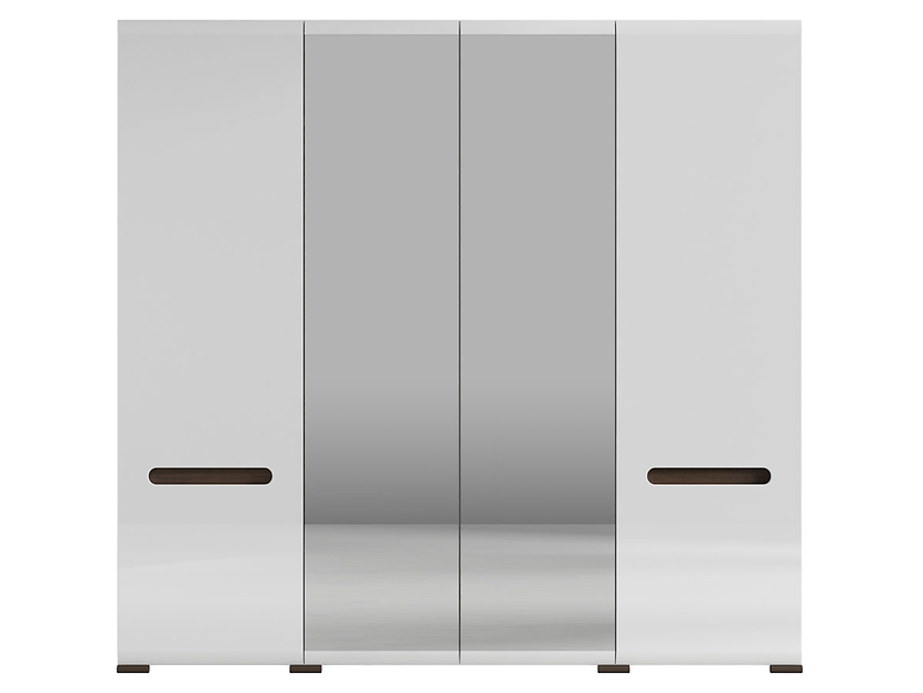 En vit högblank garderob i modern stil. En mycket rymlig garderob med fyra dörrar. Dörrarna i mittsektionen har spegelglas och inuti är garderoben smart inredd för att underlätta att hålla ordning på kläderna.Handtagen är integrerade med en wengefärgad räfflad baksida som en snygg detalj.