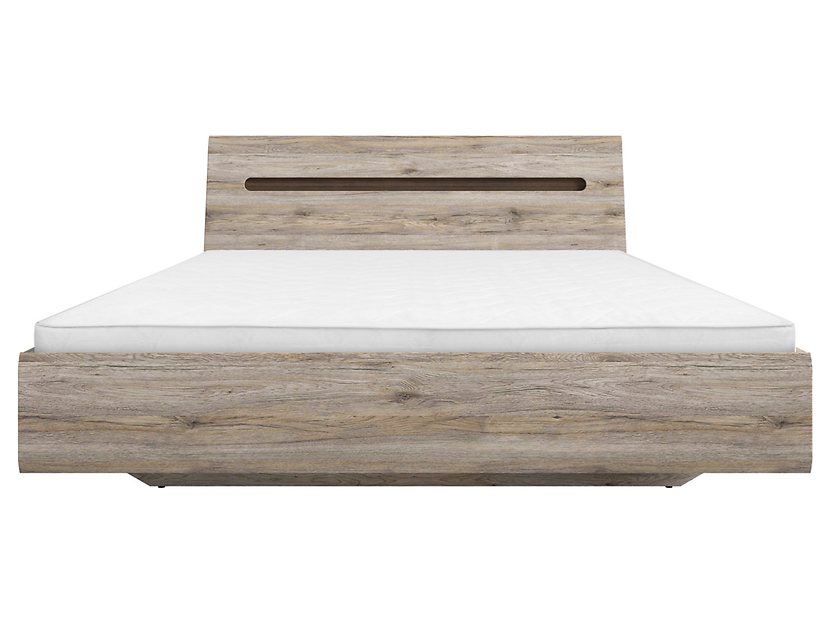 En modern sängram i ekimitation. Ett wengefärgat räfflat spår i huvudgaveln utgör en snygg detalj.