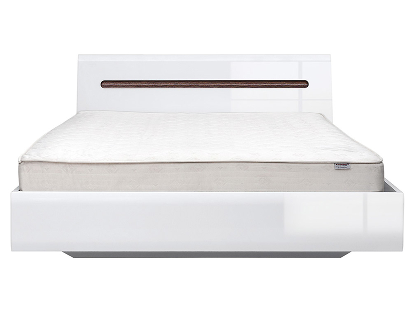 En modern sängram i vit högblank. Ett wengefärgat räfflat spår i huvudgaveln utgör en snygg detalj.