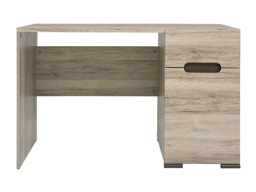 Ett modernt skrivbord tillverkat i MDF med ek-imitation och med en låda och ett praktiskt skåp med rundade former. Undertill finns en vågrät platta som förhindrar smuts på väggen och dessutom stabiliserar skrivbordet. Handtagen är integrerade med ett räfflat wenge färgat bakstycke som en snygg detalj.