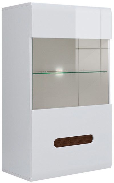 Ett snyggt väggskåp med ett glasparti i dörren. Inuti finns det en LED-beslysing som tillsammans med glaset blir mycket effektfullt. Handtaget är integrerat och har en räfflad wengefärgad baksida som en extra detalj.