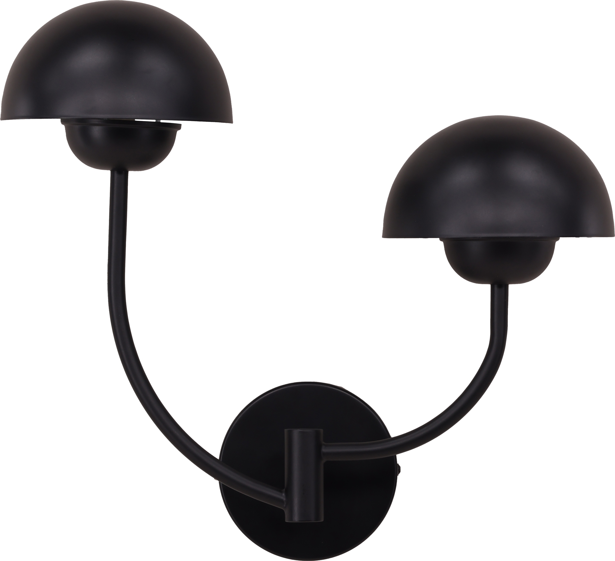 Vägglampan som består av två mindre lampor som är sammanlänkade med ett underrede i svart järn. Lamporna har ett rundat tak som ger ett behagligt ljus till rummet. Den här lampan passar perfekt för dig som söker en dekorativ men samtidigt stilren lampa med en mjuk design som passar in i de flesta rum och inredningsstilar.