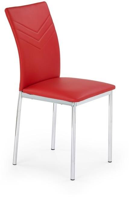 En skön matstol med en modern design. Underredet är tillverkat i kromad metall med sitsen klädd i ett mycket behagligt rött konstläder för maximal komfort.