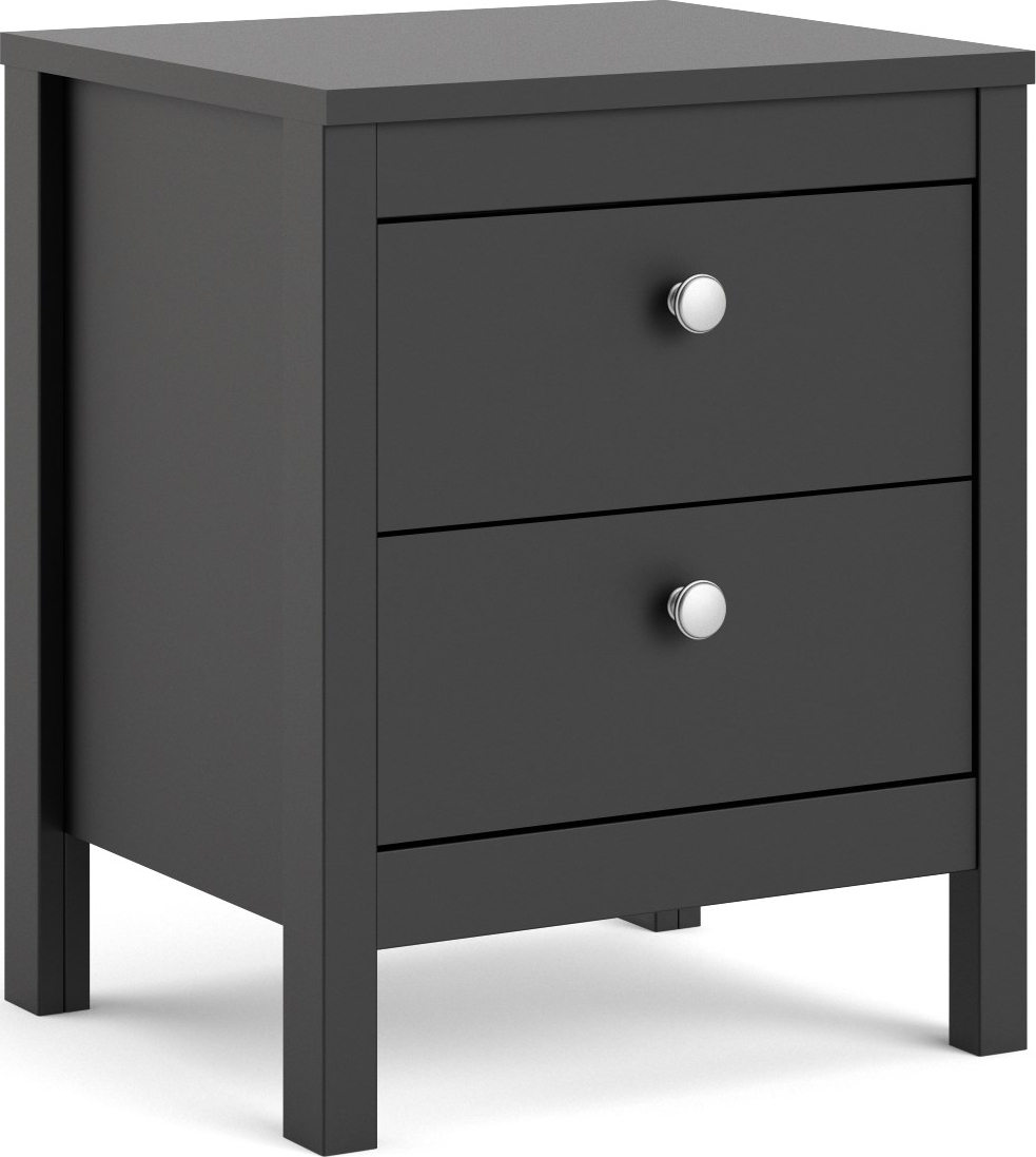 Sängbord av trä med kantband av melamin och ABS-plast. Levereras med 2 olika typer av handtag.