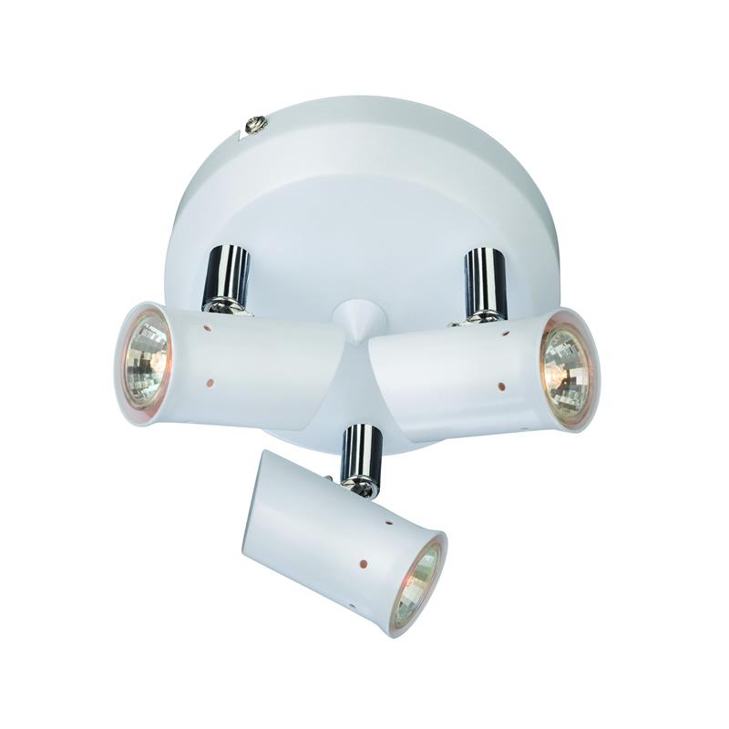 Stilren taklampa, anpassad för badrummet. Tillverkad i vit metall med detaljer i krom. Dem tre ljuskällor kan enkelt vinklas eller roteras. Fast installation. MR11/GU4 sockel. Max 20W. Dimbar. Hängs upp med takbygel. Simpel montering av lampan i badrummet.