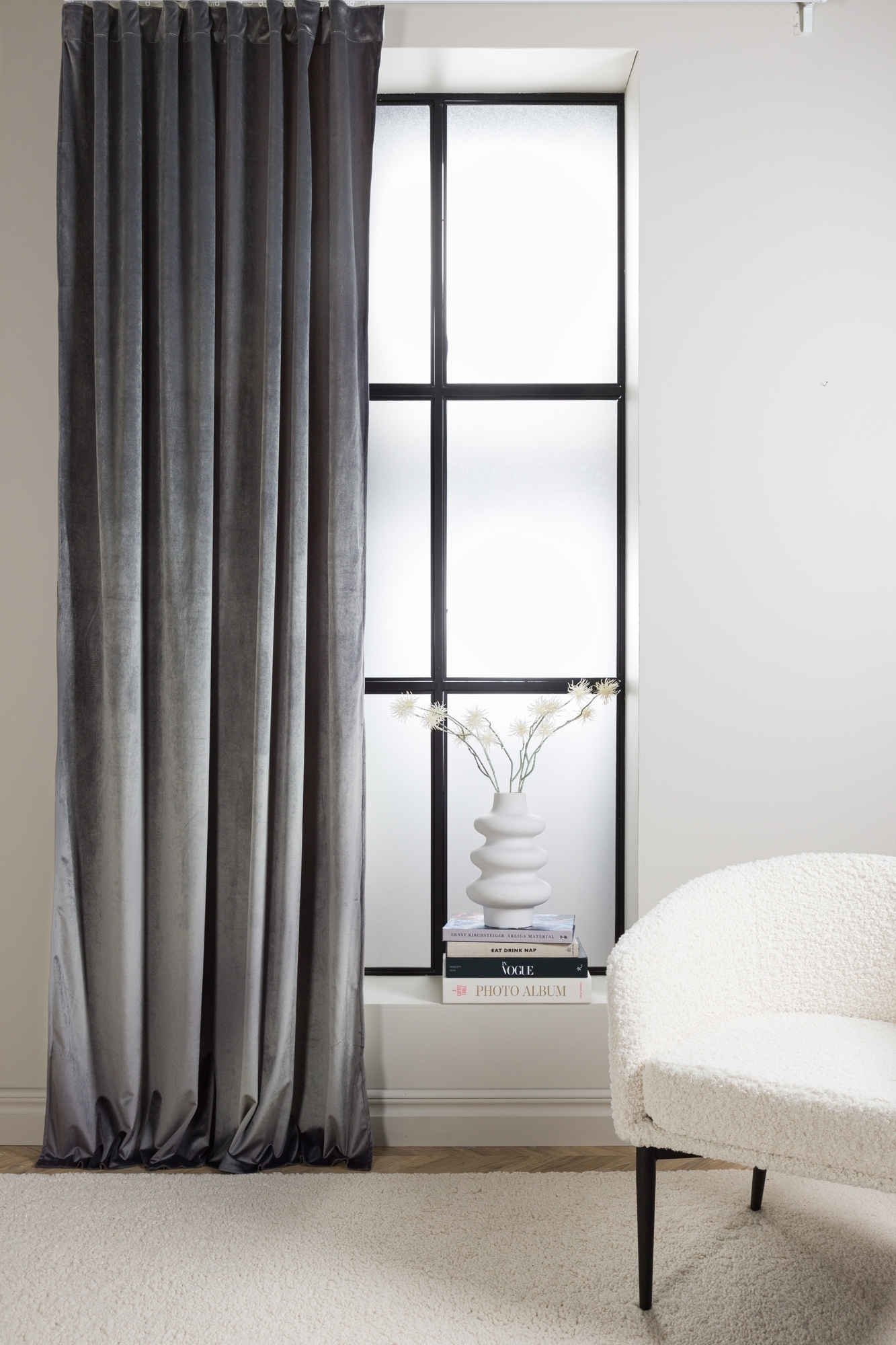 Gardinlängd i polyestersammet med en glansig yta som skimrar fint i ljuset. Gardinlängderna har påsydda multifunktionsband som gör det möjligt att hänga upp på olika sätt, antingen med fingerkrokar, dold hälla eller i gardinkanalen.