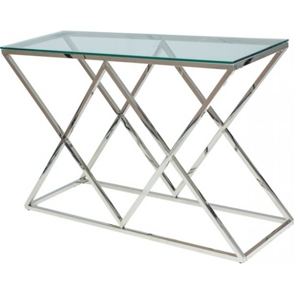 Ett konsolbord med en modern art deco design. Bordsskivan är tillverkad av härdat glas och underredet är tillverkat av kromad metall.