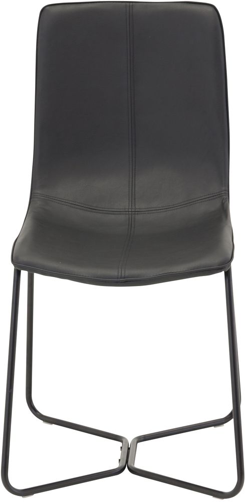 Nätt och modern stol klädd med svart tåligt PU, 100% polyester. Underrede i svart metall. Sitsen är skumstoppad. Snygg design med skön sittkomfort.
