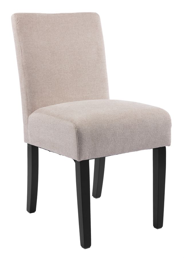 Stol klädd i ett ljusbeige tyg med stoppning av kallskum för god komfort. Svarta ben.