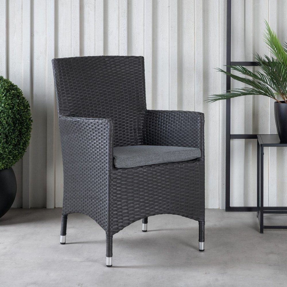 Vår omtyckta konstrottingstol från serien Malin i svart kulör. I denna karmstol med skandinavisk design kan du njuta av många middagar tillsammans med dina nära och kära under sommaren. Med slitstarkt material, en stomme i aluminium och konstrotting, får du en robust stol som står sig över tid. Sitt bekvämt i sommar! Stolen är stapelbar. Skötselråd: Konstrotting är ett plastmaterial som passar alldeles utmärkt för vårt skandinaviska klimat. Materialet är UV-beständigt och tåler väder och vind. Att det är UV-beständigt gör att möblerna inte bleknas, däremot rekommenderar vi alltid att förvara möblerna under ett möbelskydd eller på annat vis torrt och svalt - för att förlänga livslängden.