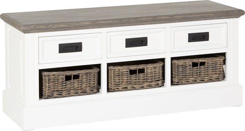Malou är en serie med fabriksmonterade produkter som är färdig att användas direkt. En klar klassiker som kan användas som hallbyrå / bänk med förvaring. 3 st lådor av rotting ingår. Vitlackat trä med toppskiva i brungrå bets.