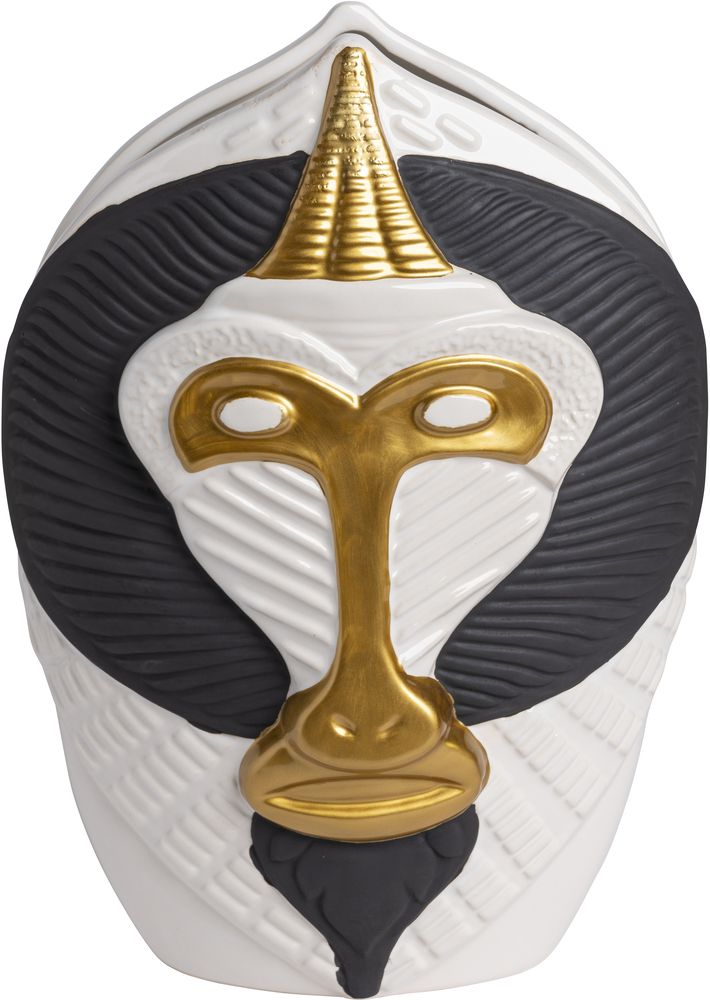 Vas av matt keramik med reliefmönster och detaljer i guld och svart.