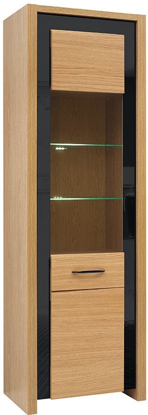 Ett fint skåp med en dörr och metallhandtag. Dörren har ett fönster i mitten och inuti skåpet finns det 5 hyllplan varav 2 är utav glas. En LED-belysning inuti skåpet blir tillsammans med glasdörren mycket effektfullt. Runt om dörren finns en svart högglansig ram som bidrar till en modern design.