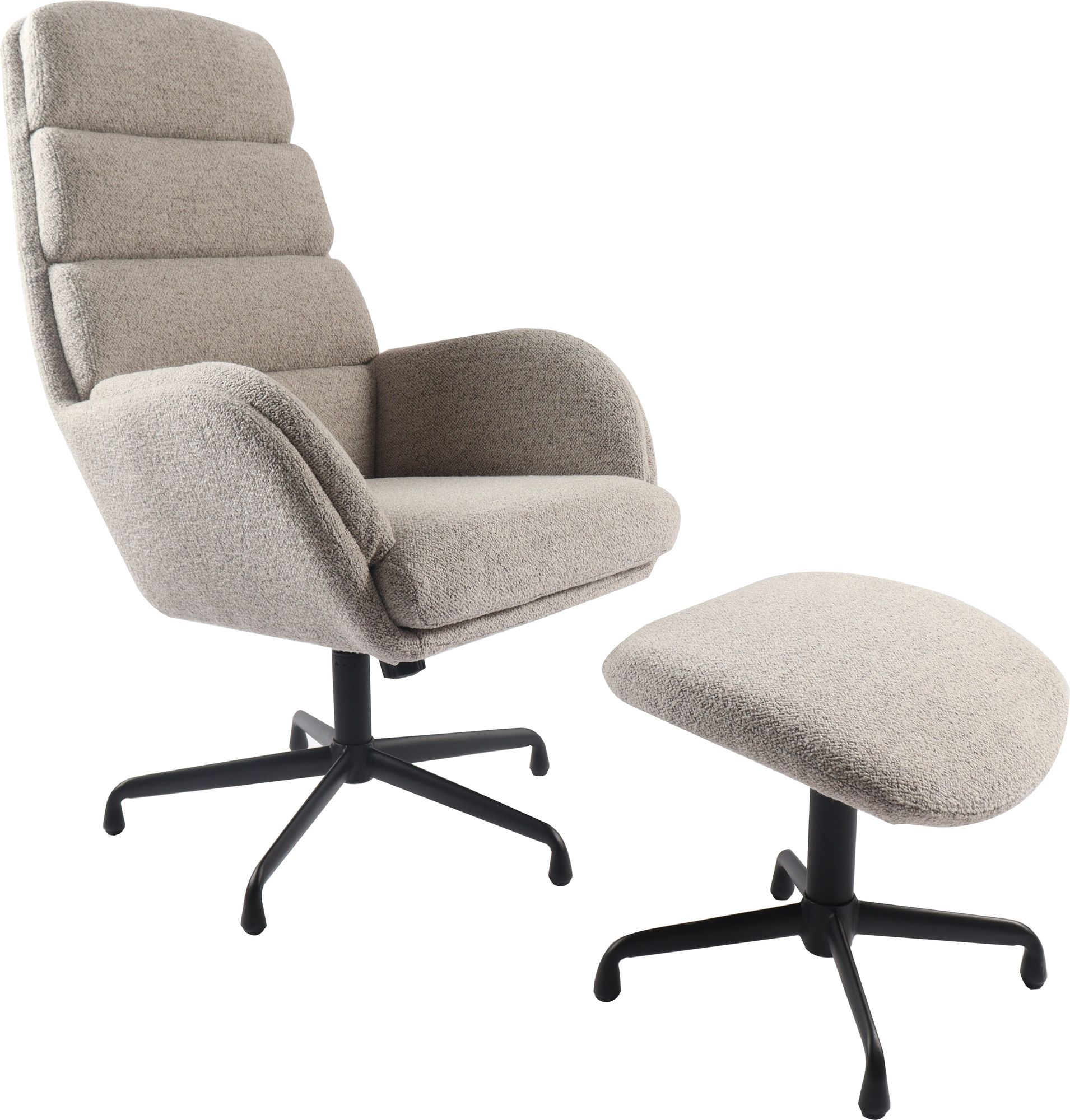 Fåtöljen är tillverkad i ett polyestertyg med en textur som är både visuellt fängslande och inbjudande mjuk. Färgen ger ett neutralt och stilrent utseende som enkelt kan integreras i olika inredningsstilar. Fåtöljen står på en robust metallram, som kompletterar det moderna utseendet med sin svarta färg.
