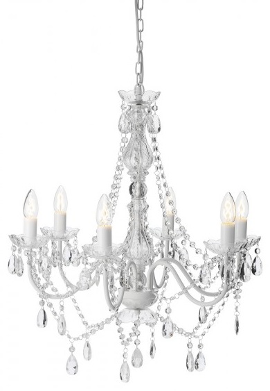 Klassisk vit takkrona modell Maria Theresia! 6 st ljuskällor som ger ett härligt sken! Stommen är tillverkad i vitlackad metall med prismor i akryl och glasdetaljer!