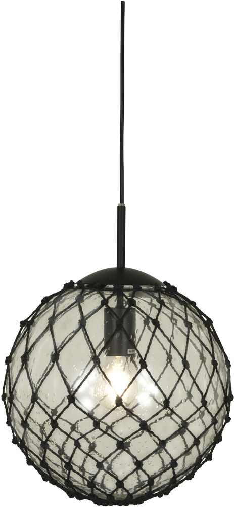 Taklampa i svart metall och klarglas, med detaljer i svart rep. Lätt upphängning i tak.