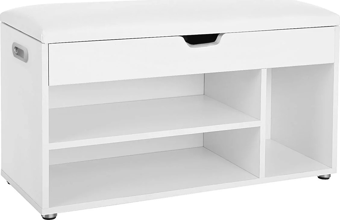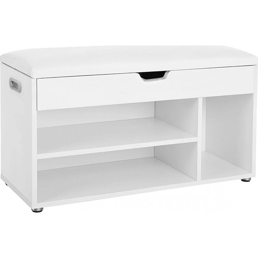 Marko hallbänk i vit spånskiva är både en bekväm sittplats och en praktisk förvaringslösning. Med en rymlig låda får du enkelt undan accessoarer eller andra småsaker och med hyllplanet får du enkelt undan skor, en perfekt kombination för en organiserad hall