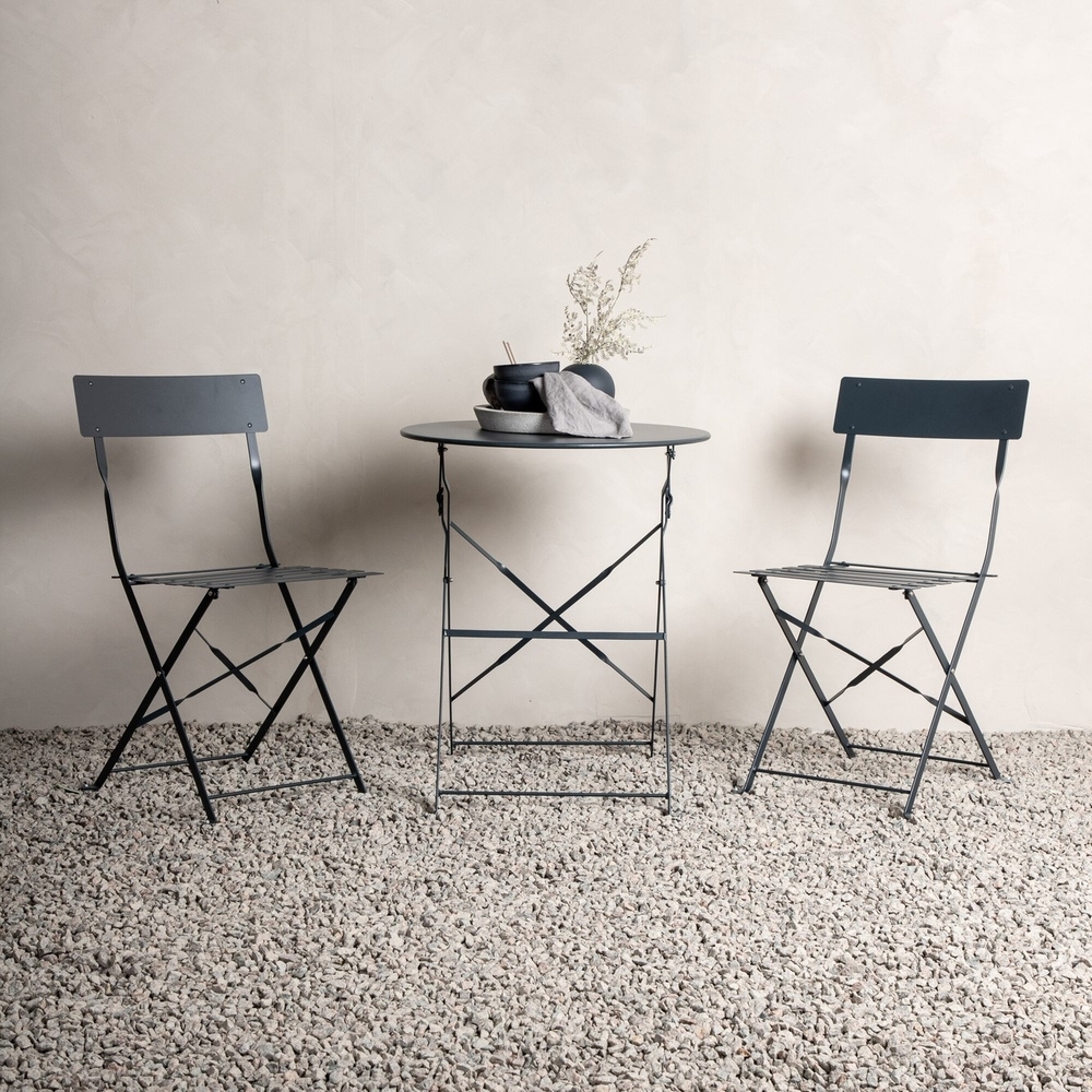 Ett snyggt och smidigt bistroset i mörkgrått som enkelt går att fälla ihop. Både snygg och praktisk så att du får plats över till annat när möblerna inte används. Ta en kopp kaffe och njut här från vår till höst!Skötselråd:Stål och mesh är två material som är avvisande mot smuts och vätskor. Däremot behöver man vara uppmärksam på att vatten ska orsaka fläckar och rost. Se därför till att torka av ytan med en en mjuk fuktad trasa och såpvatten, för att undvika att materialet rostar. Om fläckarna eller rosten sitter för hårt rekommenderas en mjuk trasa fuktad i ren alkohol. Lösningsmedel får aldrig användas på lackerad eller ytbehandlad metall. Tänk på att underlaget som möbeln står på kan orsaka missfärgningar, var vaksam. Förvara möblerna torrt eller under möbelskydd.