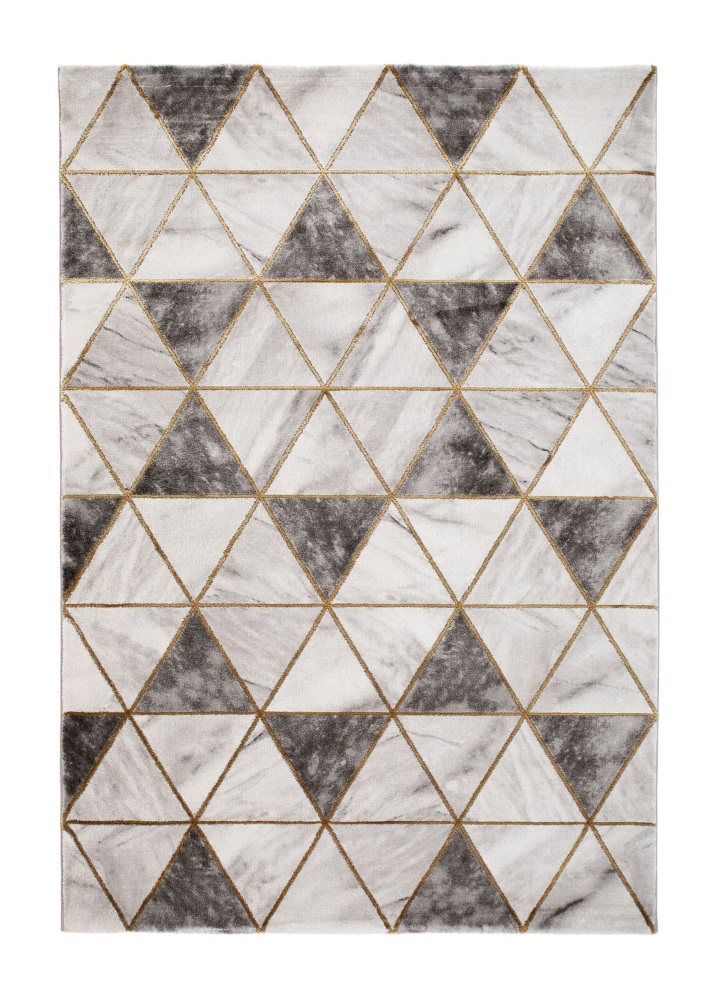Craft Trendy har en grå bottenfärg i marmor-look, med ljusgrå langettering som löper längs långsidorna. Mattan har ett rutmönster i mörkgrå och guldiga toner som är gjort i carvingteknik, vilket innebär att den har utskärningar för att göra detaljer mer framträdande.