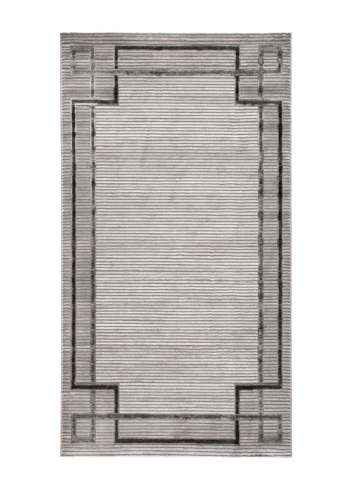 Craft Versace har en ljusgrå bottenfärg med matchande langettering som löper längs långsidorna. Mattan har ett grått randmönster som är gjort i carvingteknik, vilket innebär att den har utskärningar för att göra detaljer mer framträdande. Mattan pryds av en dekorativ bård i en otroligt snygg guldton, som skimrar beroende på hur ljuset faller.