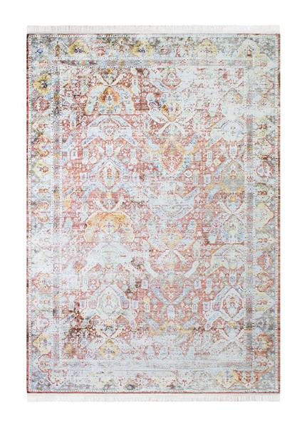 Rhoda har en bottenfärg som beroende på hur ljuset faller, skiftar i ljusstyrka mellan laxrosa och roströda toner. Mattan har ett melerat mönster i vita, gula och blå toner som ramas in av en sandfärgad langettering på långsidorna, medan kortsidorna pryds utav cremevita fransar.