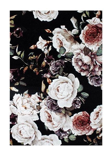 Roger har en svart bottenfärg med matchande langettering på långsidorna. Mattan har ett dekorativt mönster som består av stora blommor och blomblad i pudriga toner utav cremevitt, marsalarött och lila. Roger är maskinvävd i polypropylen, vilket är ett syntetmaterial som är lätt att rengöra och hålla fri ifrån ludd och damm.