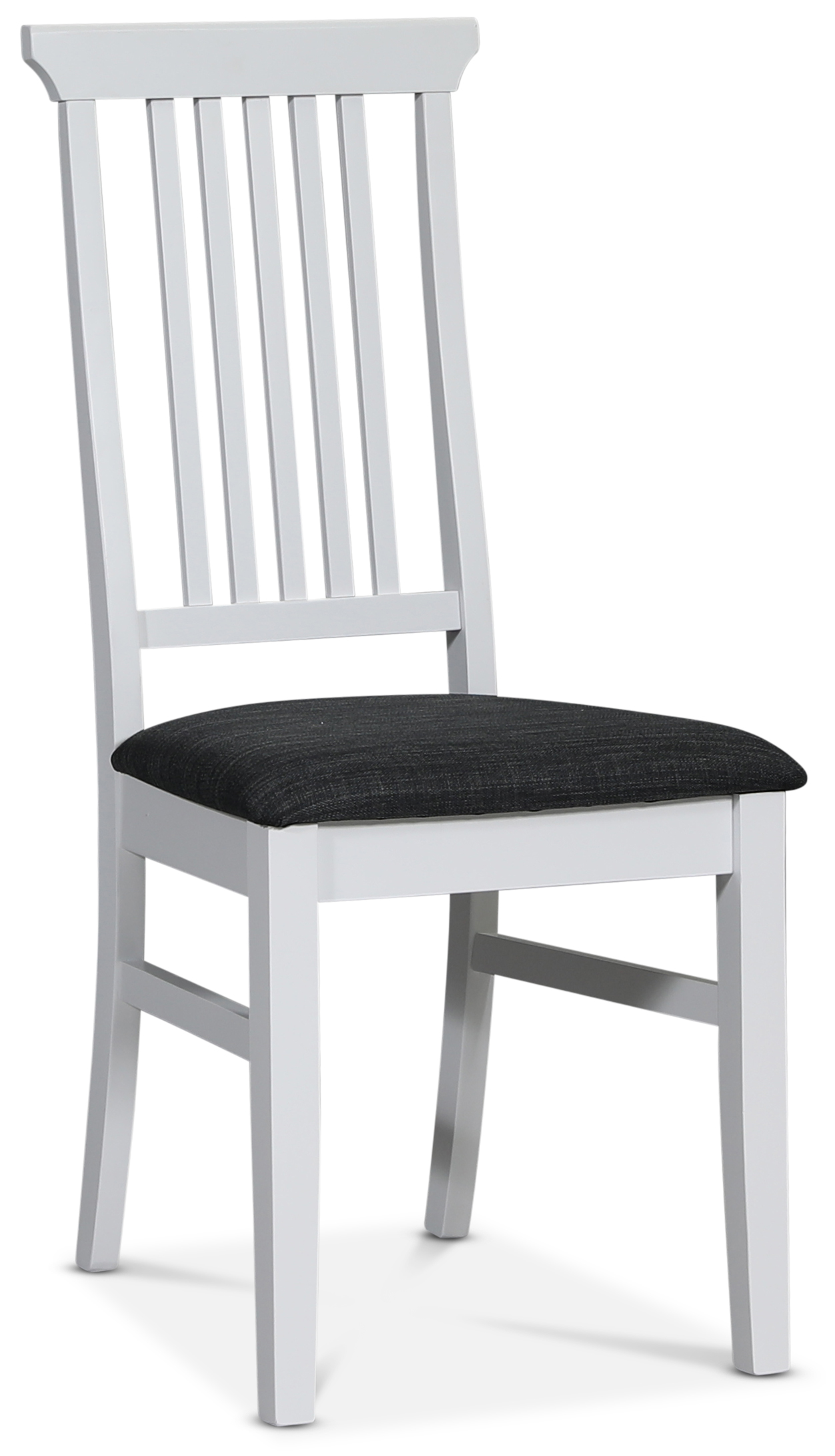 Klassisk stol i massivt vitlackat trä, klädd mjuk sits i ett slitstarkt grått tyg.